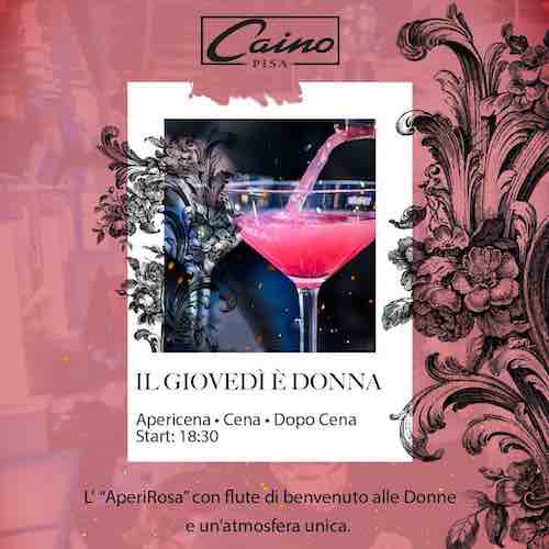 Dedicato a tutte le donne e non solo: ogni giovedì sera a Pisa va in scena AperiRosa: oltre al classico aperitivo e apericena, ogni ragazza verrà omaggiata al suo arrivo con un calice di benvenuto per una serata tutta pink. La serata per ragazze per eccellenza, ogni giovedì sera Caino. Avete trovato dove fare serata il giovedì a Pisa.