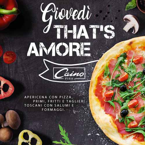 That’s Amore. Amore, ovviamente, per la cucina toscana ed italiana in generale. Ogni giovedì sera da Caino viene servito un ricco apericena con pizza, primi fritti e taglieri toscani con salumi e formaggi.